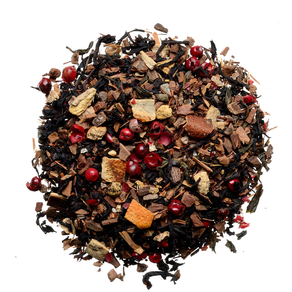 Té negro, Canela, jengibre, anís, clavo de olor, cardamomo, pimienta negra y miel.